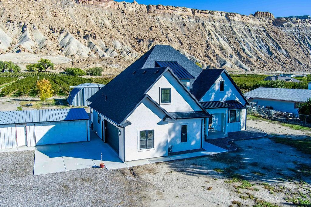 Built in 2021, this exquisite 4-bedroom, 4-bathroom home offers 2,534 sq ft of refined living space on over 3 acres with commanding views of Mt. Garfield. Designed for both comfort and sophistication, the open floor plan features expansive windows and a gourmet kitchen with premium finishes and a walk-in pantry. The primary suite provides a serene retreat with a spa-inspired bath and generous closet space. A detached garage and well-equipped shop offer ample room for projects, equipment, or storage, while the producing orchard--home to approximately 800 O'Henry late-harvest peach trees--adds both charm and functionality to the property. Enjoy modern luxury with a touch of country elegance--where stunning design meets the freedom of wide-open space.